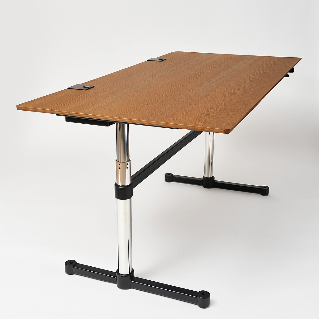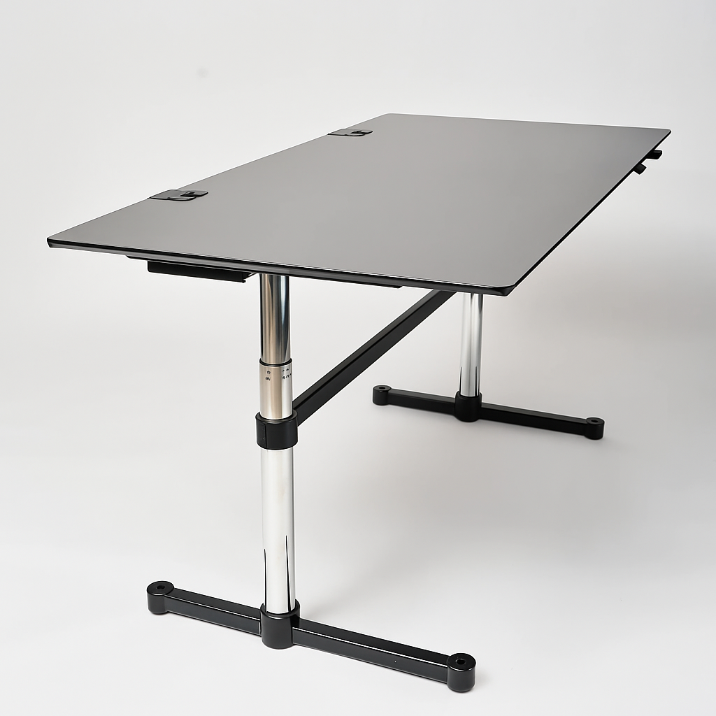 Mechanisch höhenverstellbar mittels Zugfeder, mit integrierter Kabelwanne, zugänglich durch Wegschieben des Tischblattes.