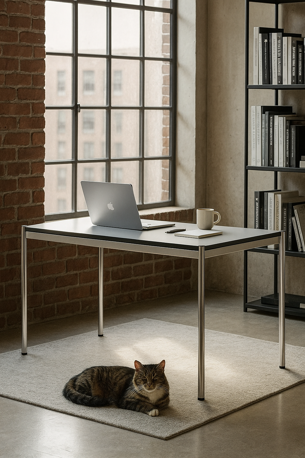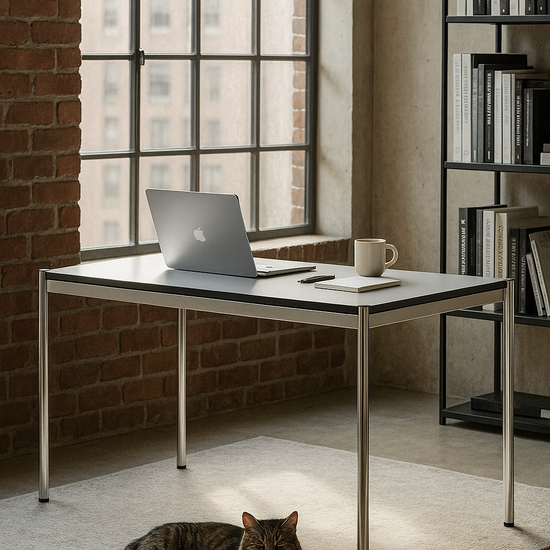 Der USM Haller Schreibtisch überzeugt durch zeitloses Design, hochwertige Materialien und maximale Flexibilität. Mit einer großzügigen Arbeitsfläche von 150 x 75 cm, einer robusten perlgrauen Laminatplatte und einem eleganten verchromten Rohrgestell bietet er die perfekte Basis für produktives Arbeiten im Homeoffice oder Büro. Der Tisch ist in allen USM Farben erhältlich und kann individuell konfiguriert werden, um sich optimal an Ihre Bedürfnisse und Ihren Einrichtungsstil anzupassen. Setzen Sie auf Schweizer Qualität, Langlebigkeit und ein modernes, urbanes Design – der USM Haller Schreibtisch ist die ideale Wahl für anspruchsvolle Arbeitsumgebungen.