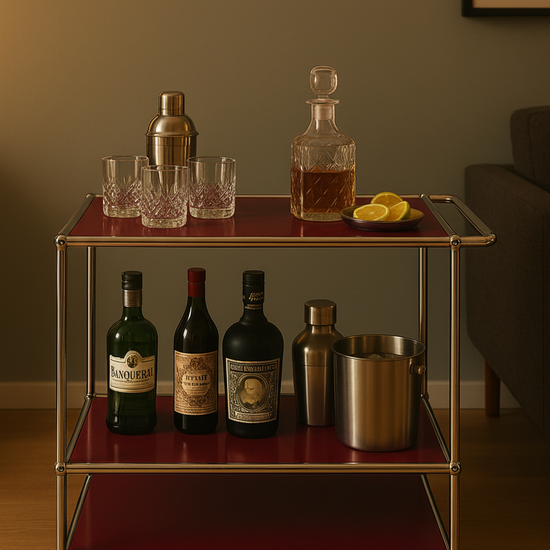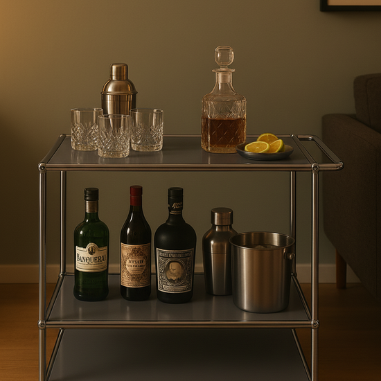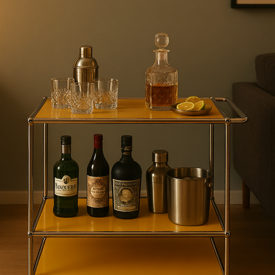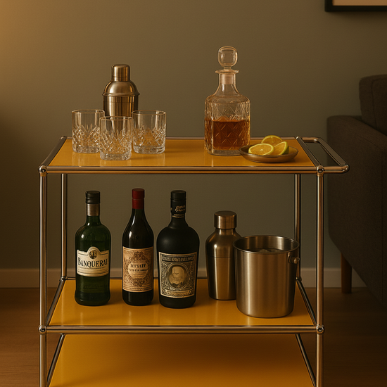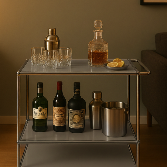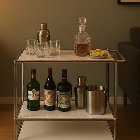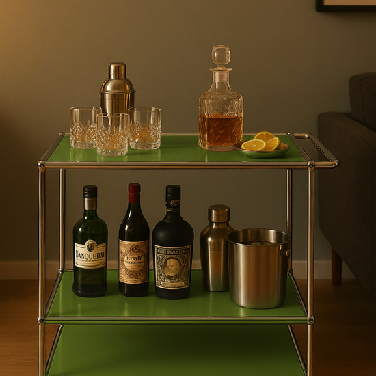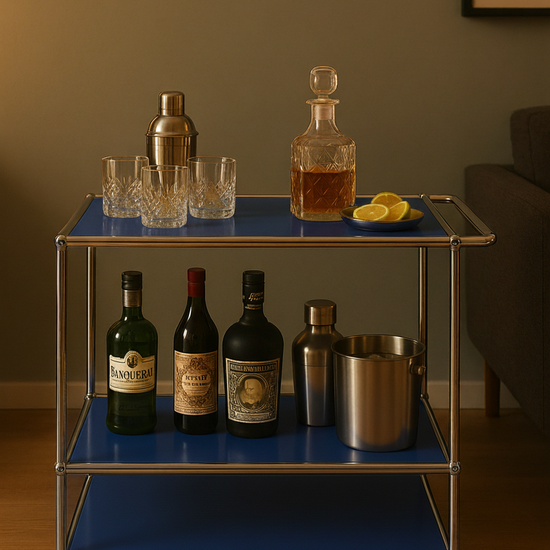 Der kompakte USM Haller Bartrolley auf Rollen vereint zeitloses Design mit funktionaler Raffinesse. Ausgestattet mit großzügigen Ablageflächen bietet er Platz für Flaschen, Gläser und Barzubehör. Dank der leichtgängigen Rollen lässt sich der Trolley flexibel bewegen – ideal für stilvolles Servieren im Wohnzimmer, auf Events oder im Büro.