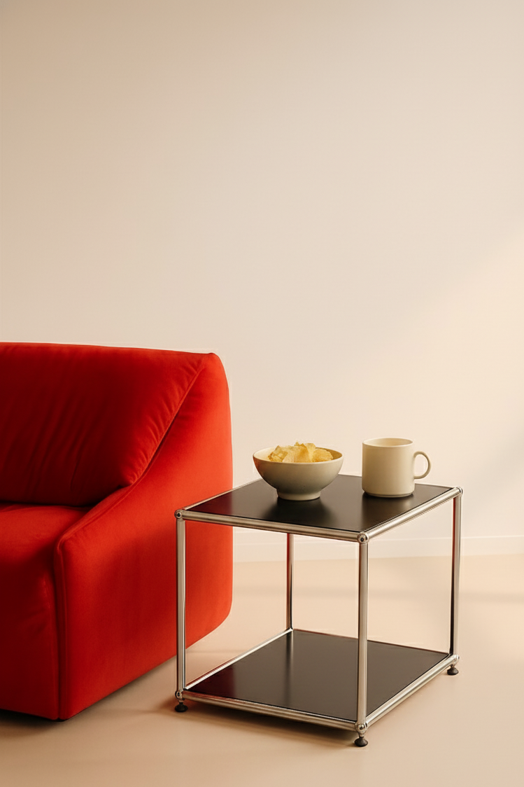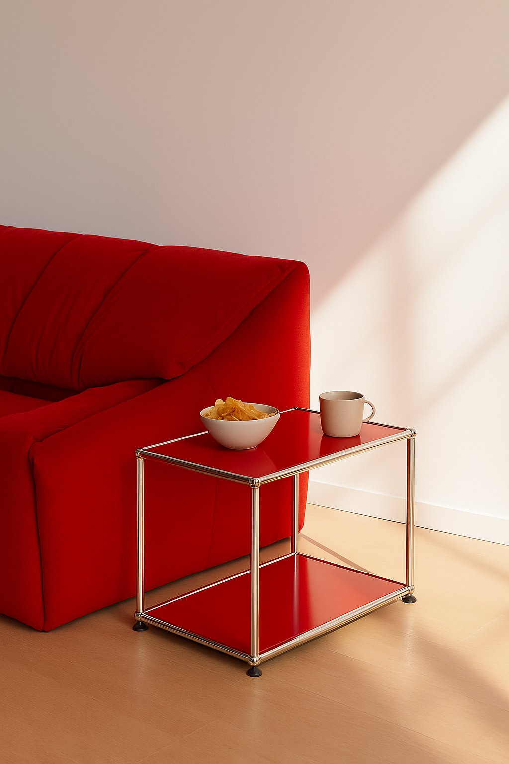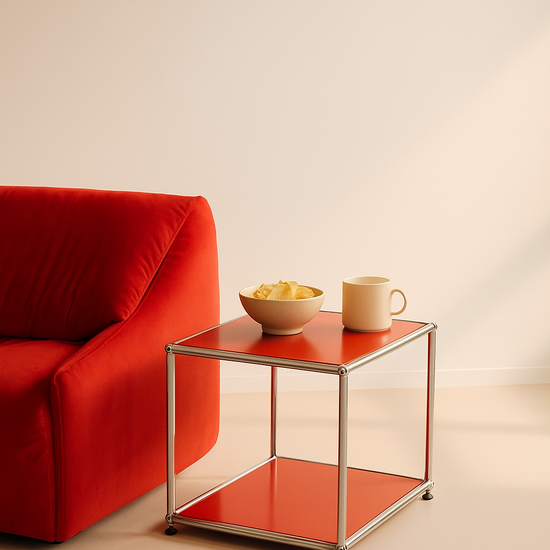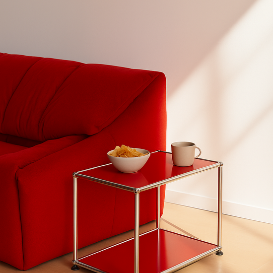 Der USM Haller Beistelltisch in Rot überzeugt durch zeitloses Design, hochwertige Materialien und maximale Flexibilität. Mit seinem ikonischen, verchromten Rohrrahmen und zwei offenen Ebenen bietet er stilvolle Ablagefläche für Wohn- oder Arbeitsbereiche. Die leuchtende rote Farbe setzt einen modernen Akzent und lässt sich individuell anpassen – der Tisch ist in allen USM Farben erhältlich und kann nach Wunsch konfiguriert werden. Perfekt für Liebhaber minimalistischer Ästhetik und höchste Materialqualität.