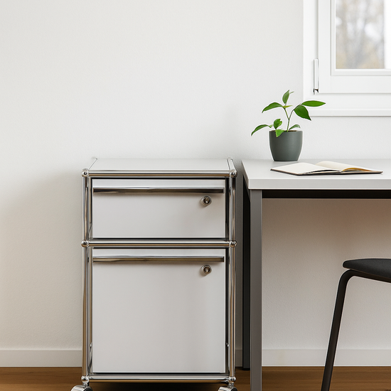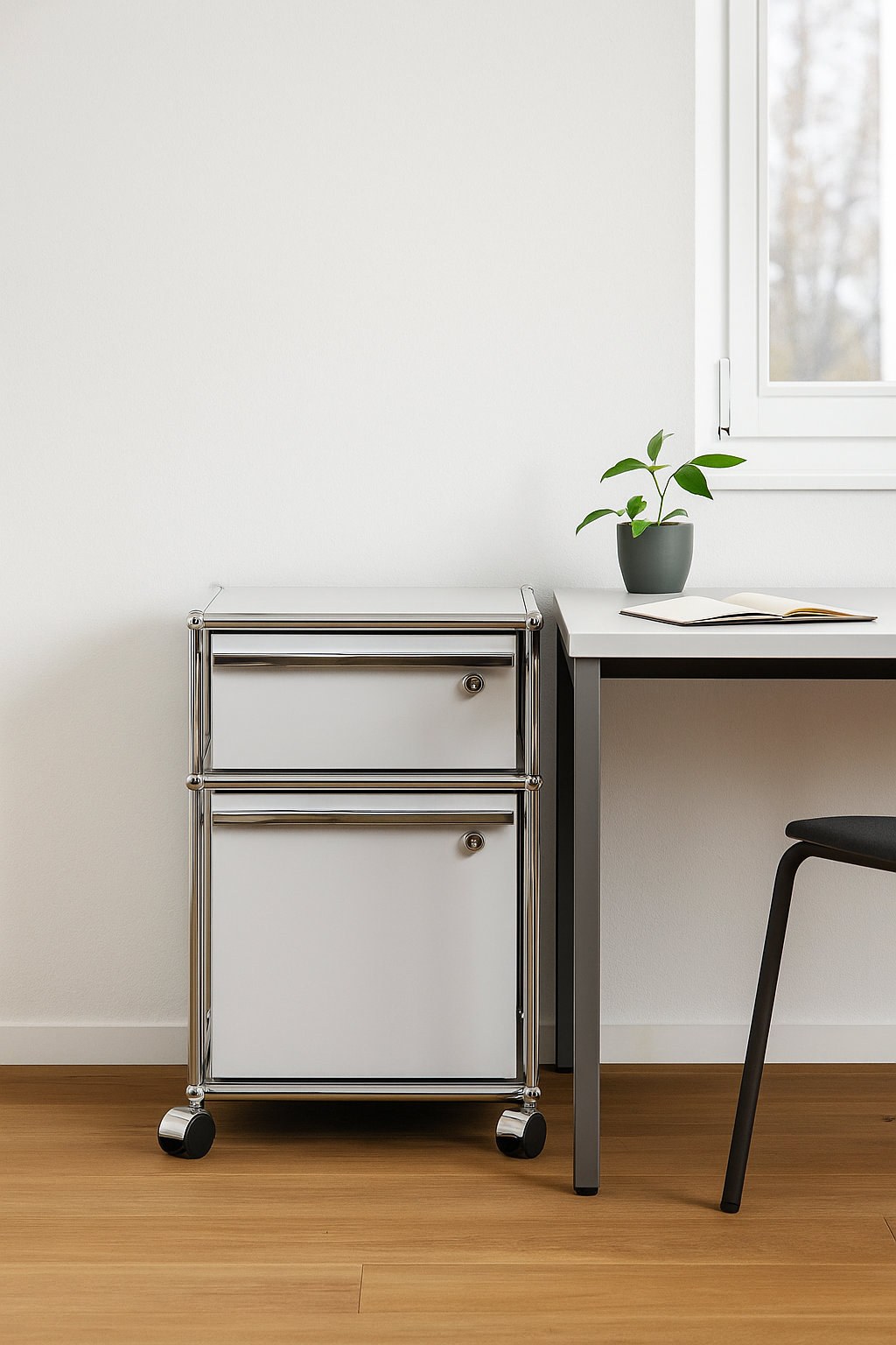 Der USM Haller Korpus in Lichtgrau auf Rollen überzeugt durch zeitloses Design und höchste Funktionalität. Mit seinem verchromten USM Rohrrahmen, matten lichtgrauen Fronten, einer geräumigen Schublade und einem abschließbaren Fach bietet er optimalen Stauraum für Ihr Home-Office oder Büro. Dank der Rollen ist der Korpus flexibel einsetzbar und lässt sich mühelos verschieben. Das hochwertige Möbelstück kann in allen USM Farben bestellt und individuell konfiguriert werden, um sich perfekt an Ihre Bedürfnisse und Ihren Einrichtungsstil anzupassen. Ideal für eine aufgeräumte, moderne Arbeitsumgebung.