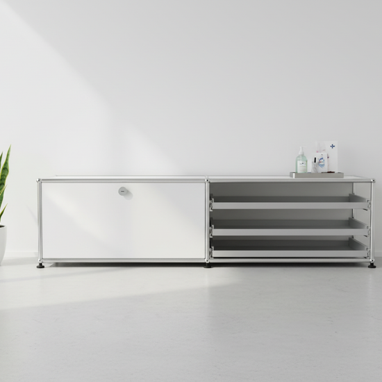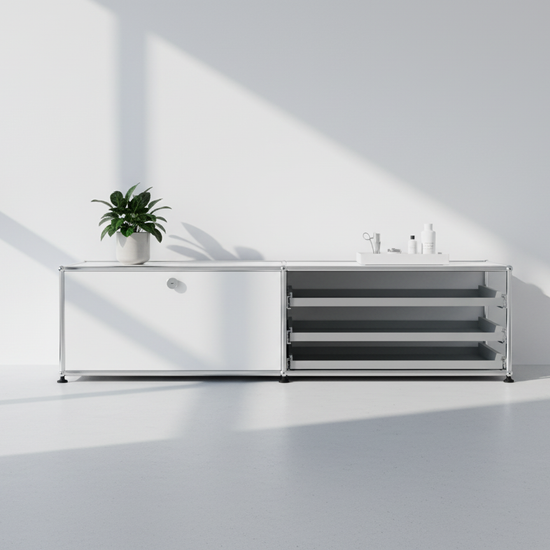 Das USM Haller Lowboard #1253 überzeugt durch zeitloses Design, klare Linien und hochwertige Verarbeitung. Das vielseitige Lowboard ist in allen USM Farben erhältlich und lässt sich individuell konfigurieren, um perfekt auf Ihre Bedürfnisse abgestimmt zu werden. Die makellose Oberfläche und die präzise Verarbeitung machen das Lowboard zur idealen Wahl für moderne Arbeits- und Wohnbereiche. Dank seines modularen Aufbaus bietet das USM Haller Lowboard #1253 flexible Stauraumlösungen und setzt stilvolle Akzente in jedem Raum.