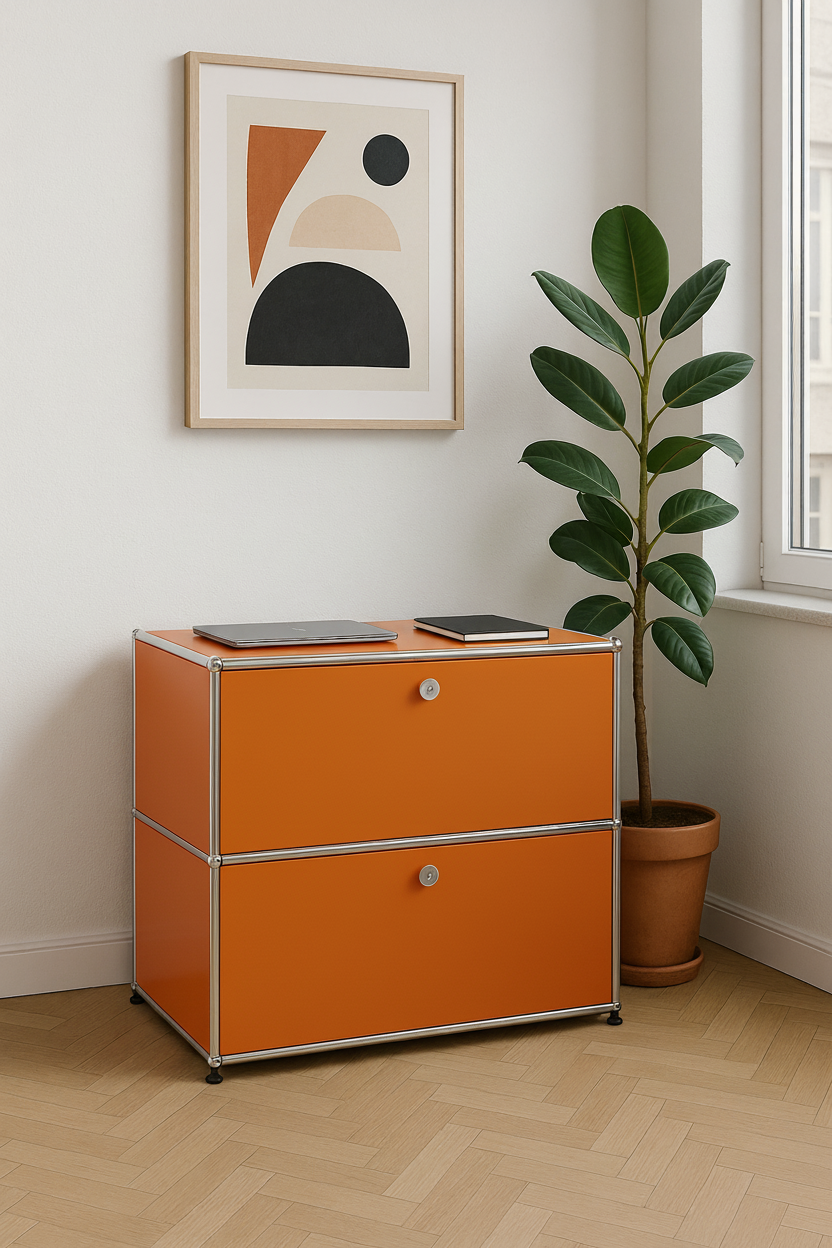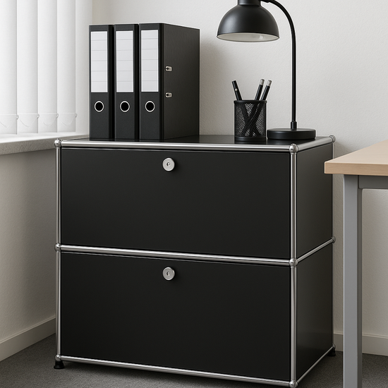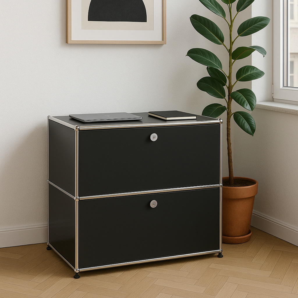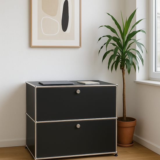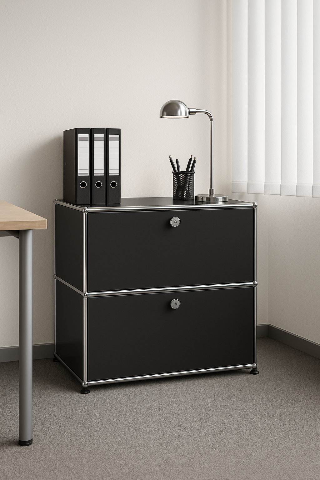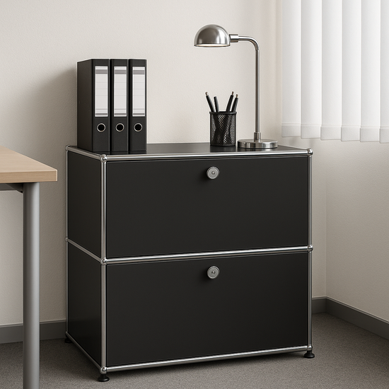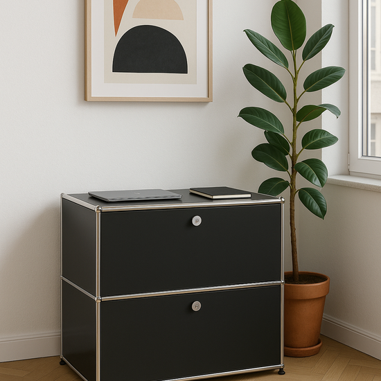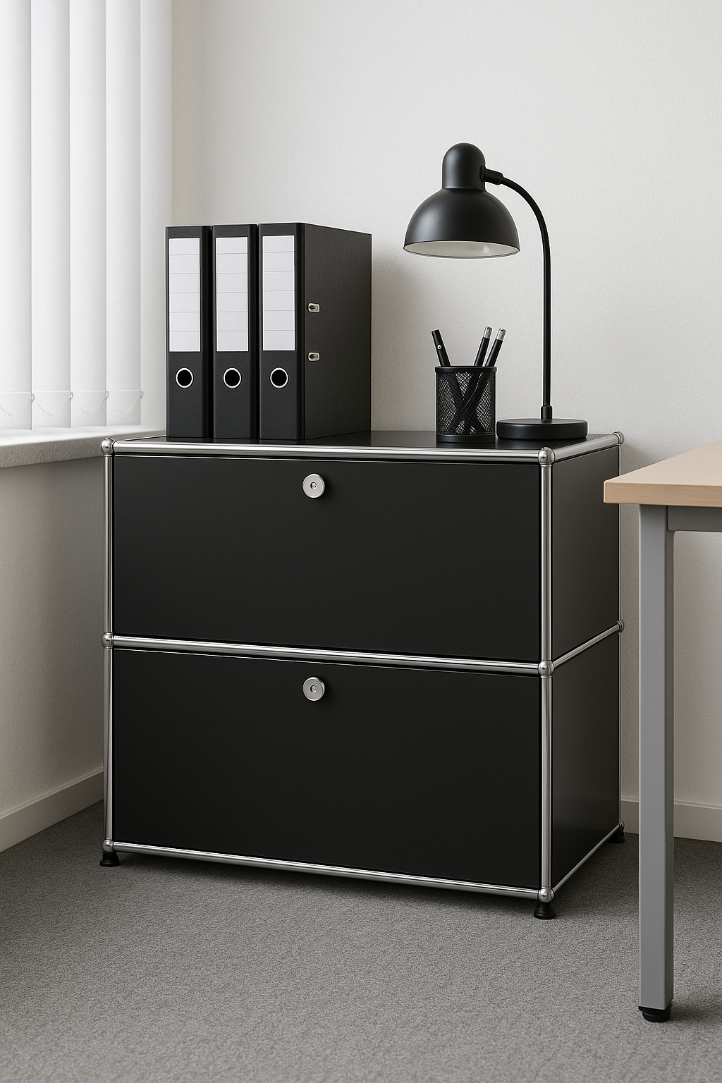 Das kompakte USM Haller Regal 1x2 in der Graphitschwarz ist die ideale Lösung für stilvolles Arbeiten – ob im Homeoffice, Studio oder klassischen Büro. Mit seinem reduzierten Format bietet es zwei geschlossene Fächer, die perfekt für Aktenordner, Bücher, Büromaterial oder dekorative Elemente genutzt werden können.