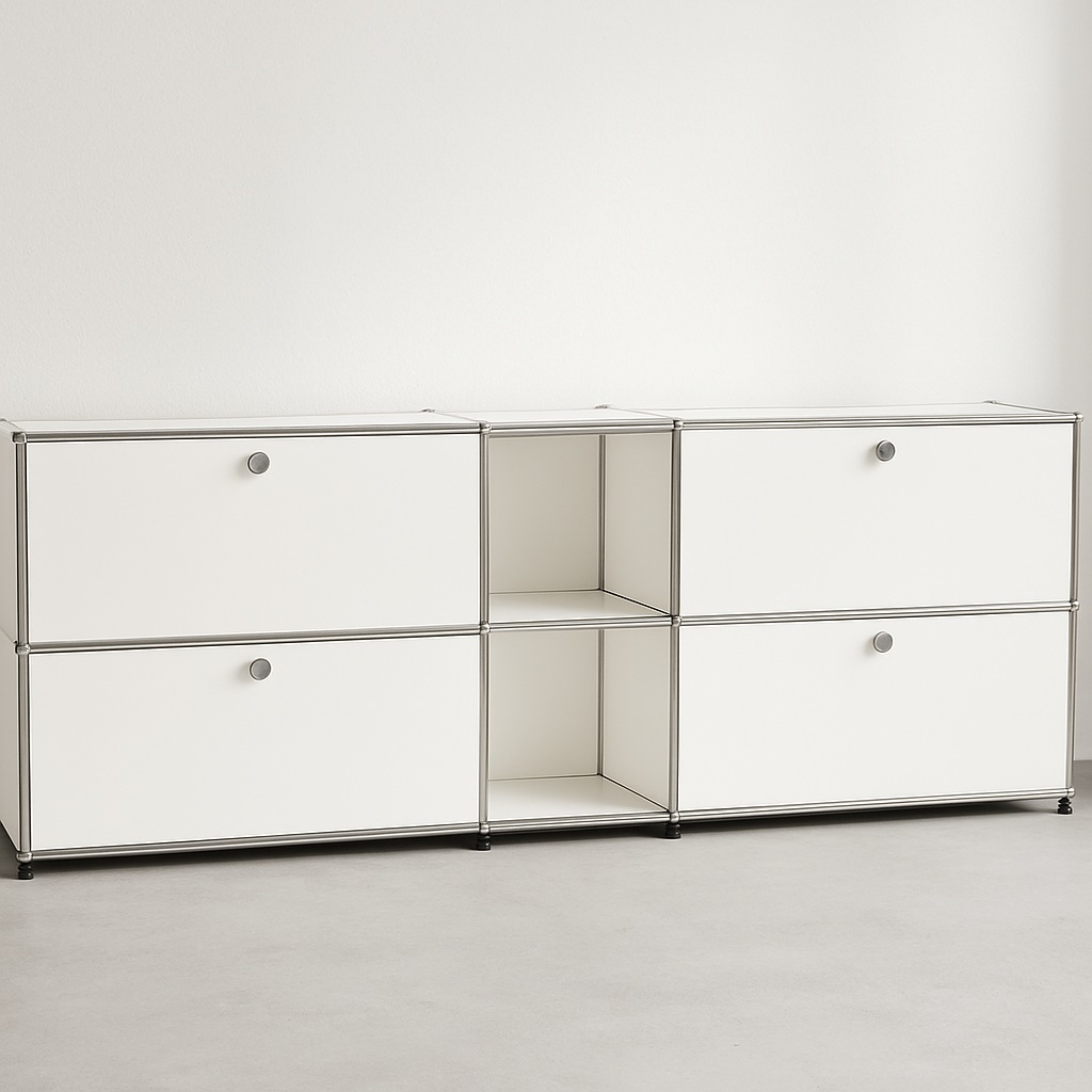 Das USM Haller Sideboard #1116 in Reinweiss überzeugt durch zeitloses, minimalistisches Design und höchste Verarbeitungsqualität. Mit klaren Linien, glänzender Oberfläche und ikonischem USM-Stil ist dieses Sideboard die perfekte Lösung für stilvolle Aufbewahrung im Wohn- oder Arbeitsbereich. Es bietet grosszügigen Stauraum und lässt sich individuell konfigurieren – wählen Sie aus allen USM Farben und passen Sie das Sideboard Ihren Bedürfnissen an. Das USM Haller Sideboard #1116 vereint Funktionalität und Ästhetik und ist ein langlebiges Möbelstück für moderne, anspruchsvolle Einrichtungen.