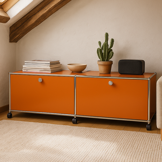 Das USM Haller Sideboard in Reinorange bringt frische Energie und Charakter in jeden Raum. Die leuchtende Farbe trifft auf das zeitlose, modulare Design des USM Möbelbausystems – klar, funktional und hochwertig verarbeitet. Zwei geschlossene Fächer bieten Platz für Bücher, Technik oder Geschirr und machen das Sideboard zum vielseitigen Begleiter im Wohn-, Arbeits- oder Essbereich. Reinorange setzt dabei ein bewusstes Statement – mutig, modern und voller Persönlichkeit.