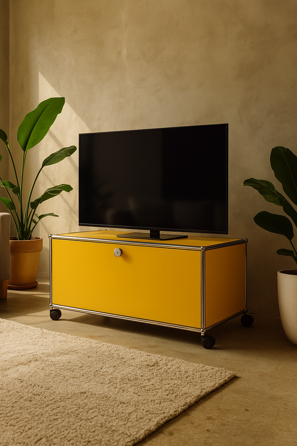 Das USM Haller TV Möbel überzeugt durch zeitloses, minimalistisches Design und höchste Funktionalität. Das modulare TV-Möbel ist mit einem eleganten, verchromten Rohrrahmen und einer abschließbaren Klapptüre ausgestattet. Dank der Rollen bleibt es flexibel und mobil einsetzbar. Das Möbelstück ist in allen USM Farben erhältlich und kann individuell konfiguriert werden, um sich perfekt an Ihre Wohnsituation anzupassen. Hochwertige Materialien und präzise Verarbeitung garantieren Langlebigkeit und Stil – ideal für moderne Wohnräume, die Wert auf Design und Qualität legen.