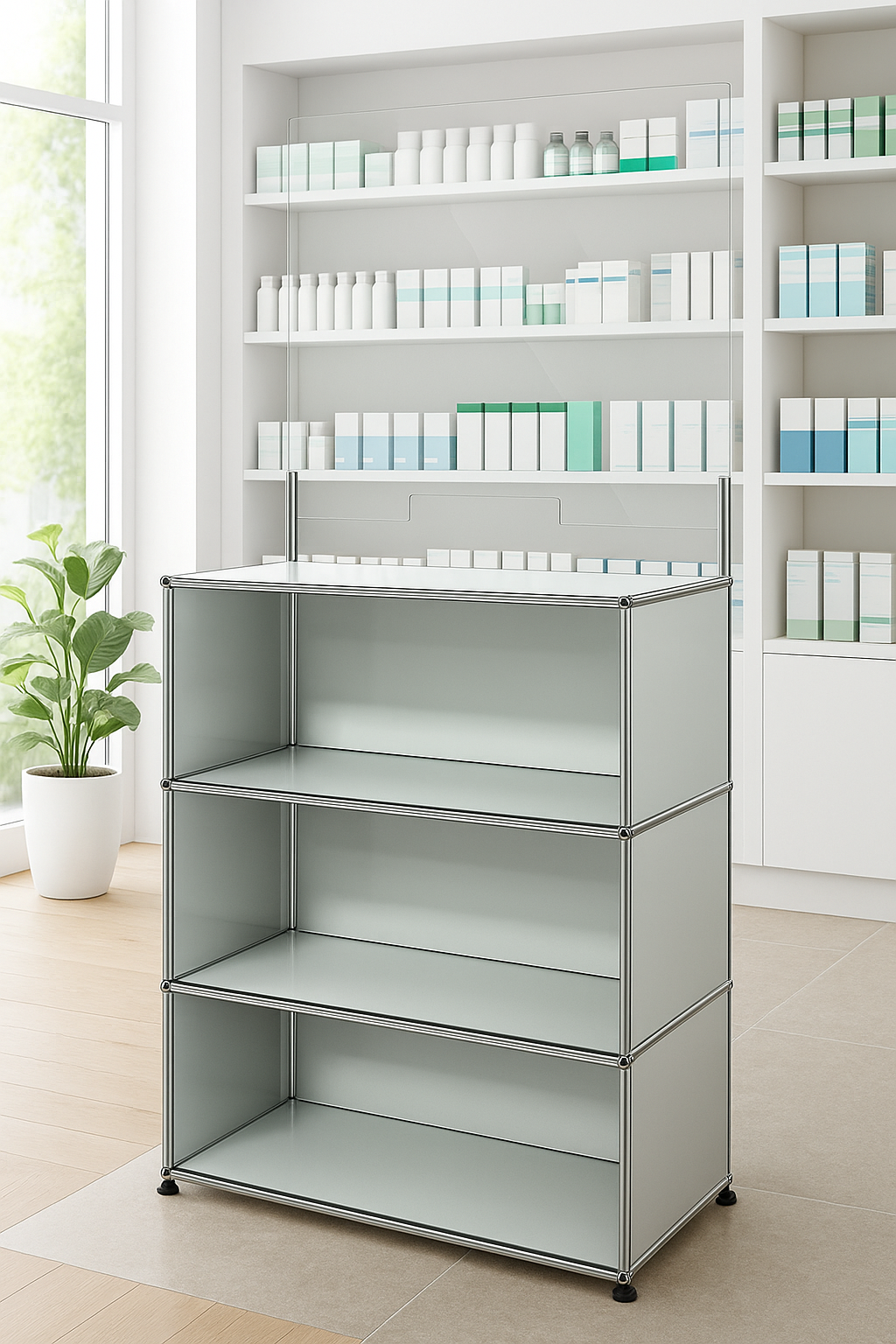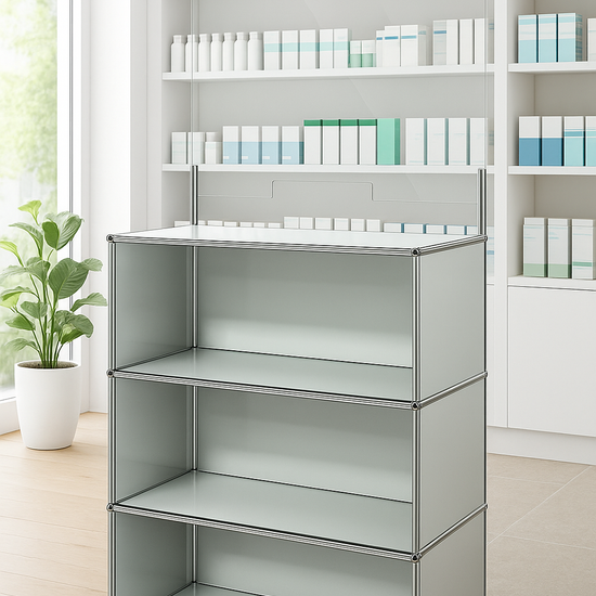 Der Tresen ist individuell konfigurierbar und in allen USM Farben erhältlich, sodass er perfekt an Ihre Wünsche und Ihr Corporate Design angepasst werden kann. Setzen Sie auf Flexibilität, Langlebigkeit und stilvolle Funktionalität mit dem USM Haller Verkaufstresen in Lichtgrau.