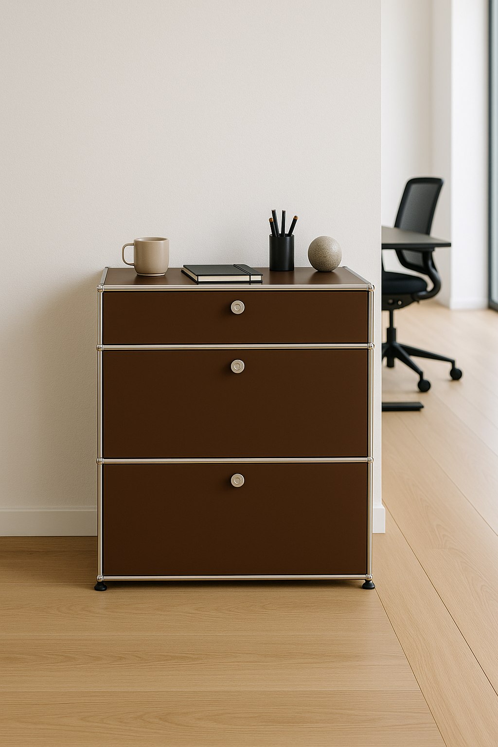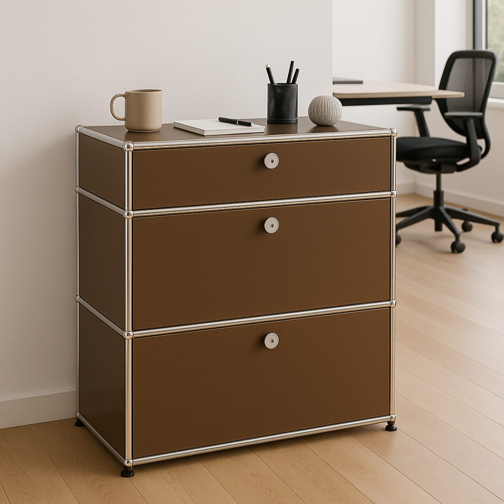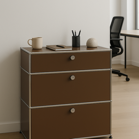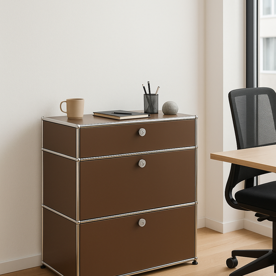 Das kompakte USM Haller Regal 1x3 in der eleganten Farbe Braun ist die ideale Lösung für stilvolles Arbeiten – ob im Homeoffice, Studio oder klassischen Büro. Mit seinem reduzierten Format bietet es drei geschlossene Fächer, die perfekt für Aktenordner, Bücher, Büromaterial oder dekorative Elemente genutzt werden können.