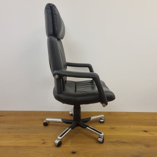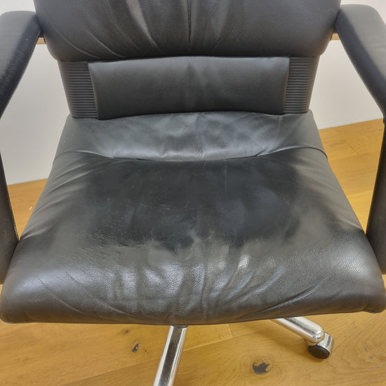 Der Vitra Imago, ein eleganter Klassiker des renommierten Designers Mario Bellini, überzeugt durch zeitloses Design und erstklassige Verarbeitung. Der hochwertige Bürodrehstuhl mit schwarzem Lederbezug und verchromtem Gestell bietet ausgezeichneten Sitzkomfort.